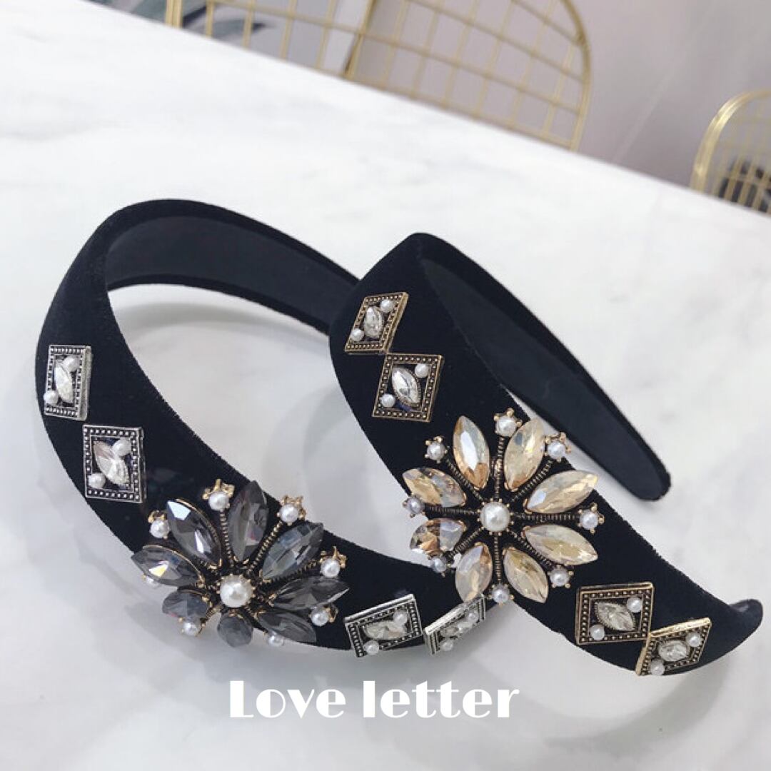 ベロア生地にアンティーク調のパーツとキラキラなビジューが施されたカチューシャはキレイめからカジュアルスタイルまで幅広く合わせて頂ける万能アイテムになる事、間違いなしです☺︎♪