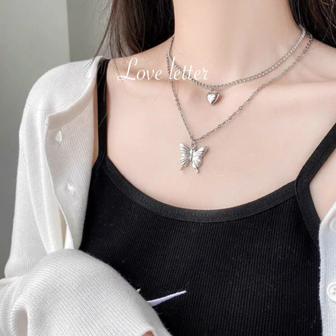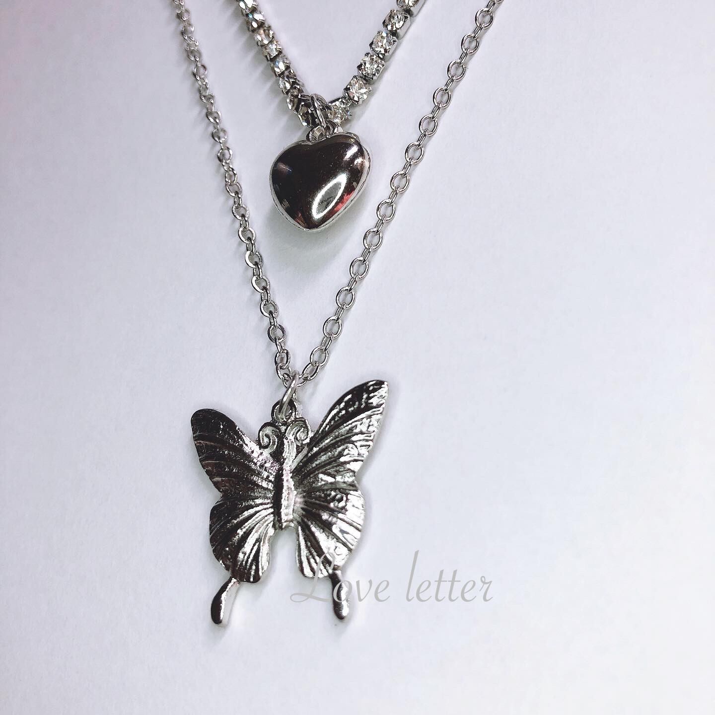 キラキラ輝くシルバービジューハートチョーカーに、シルバーバタフライネックレスの2点setです♡