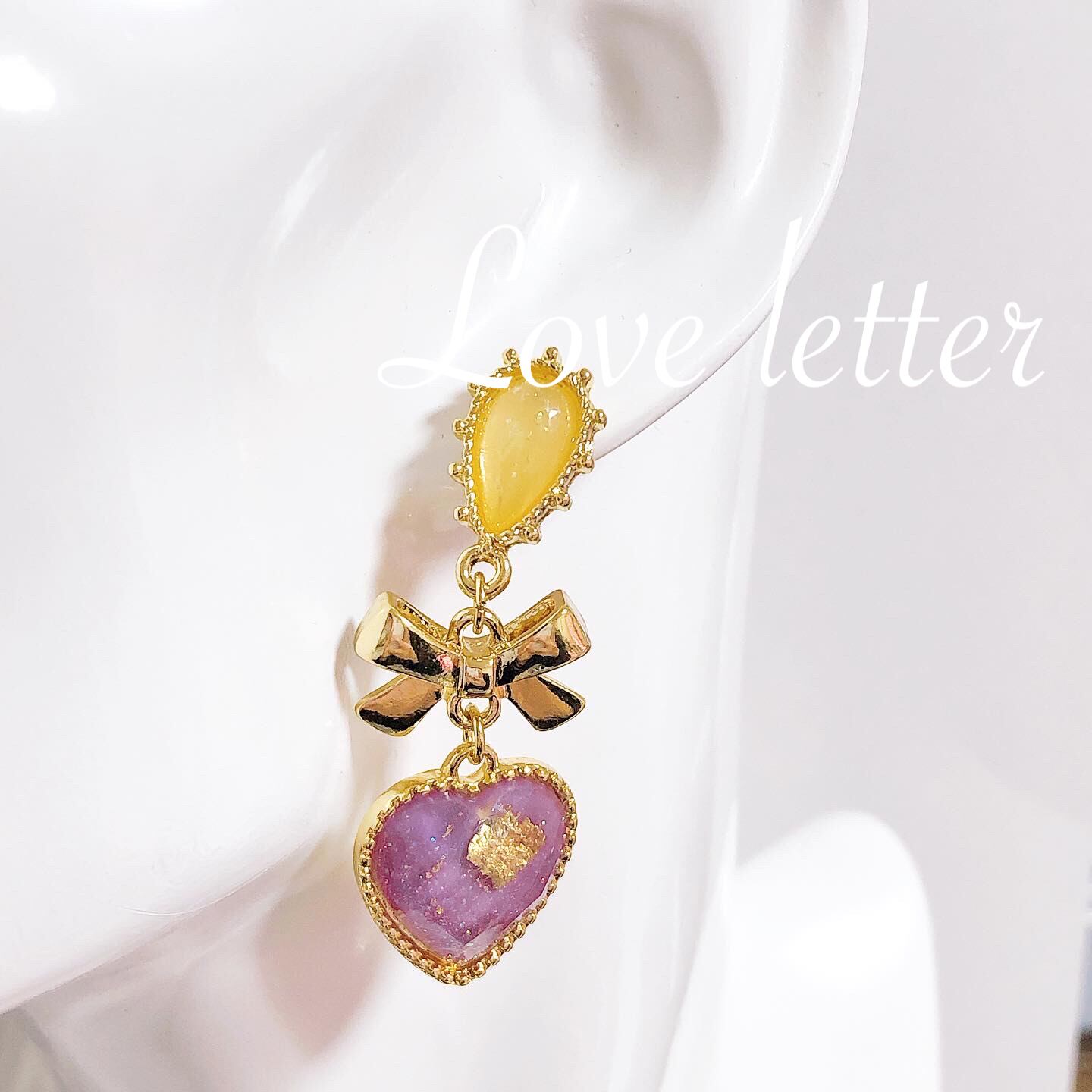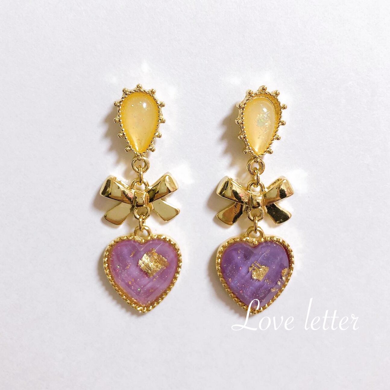 パープルラメリボンハートイヤリング 韓国 量産型 地雷 ゆめかわアクセサリー