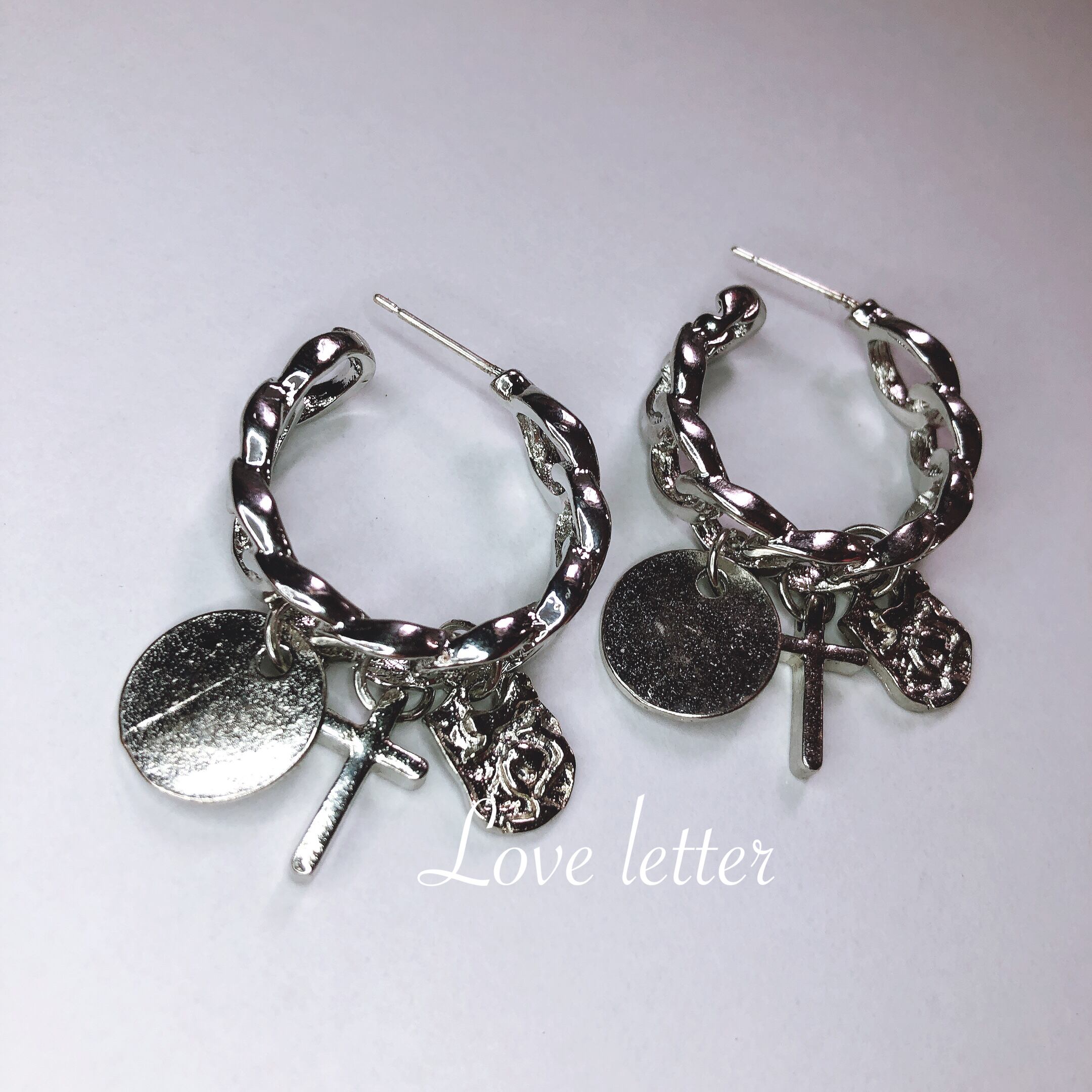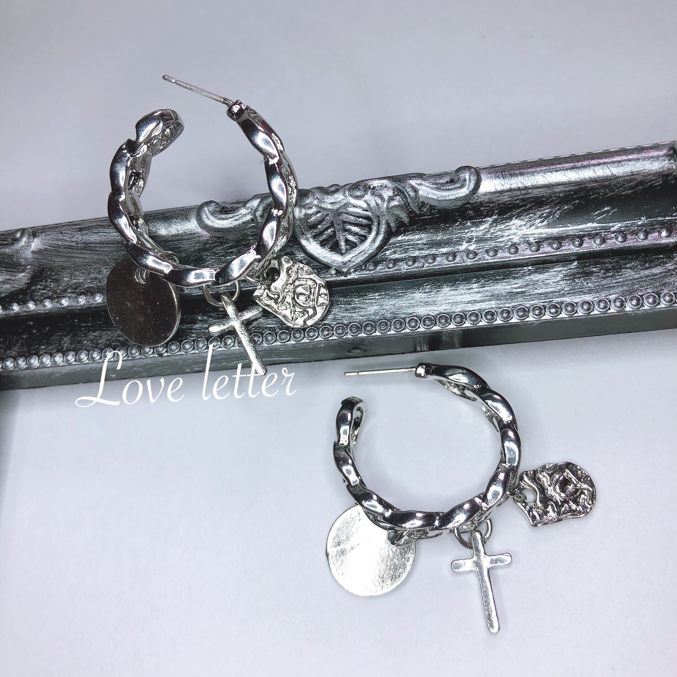 チェーンフープにクロスパーツなどが施されているカッコかわいいピアスが入荷しました❤︎
