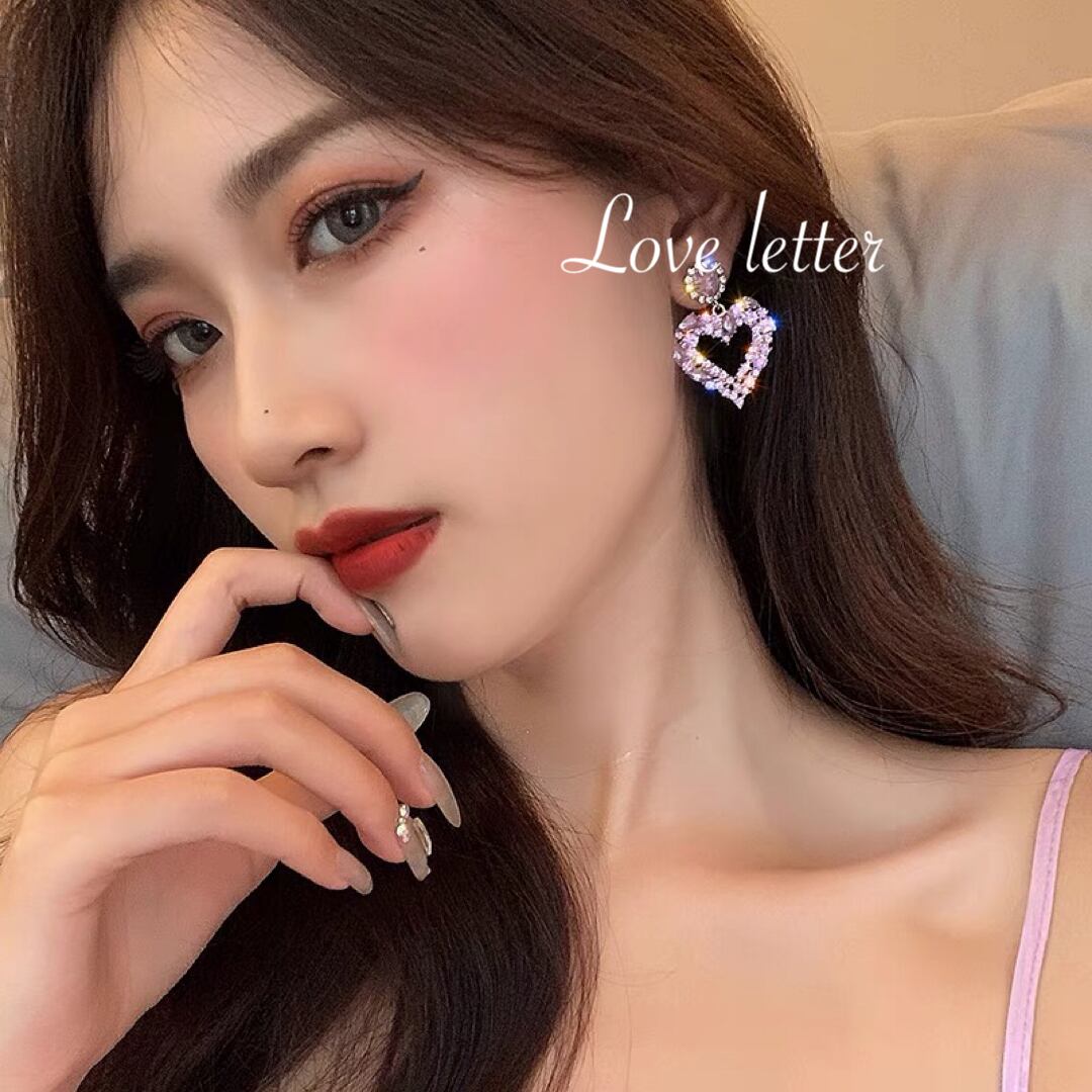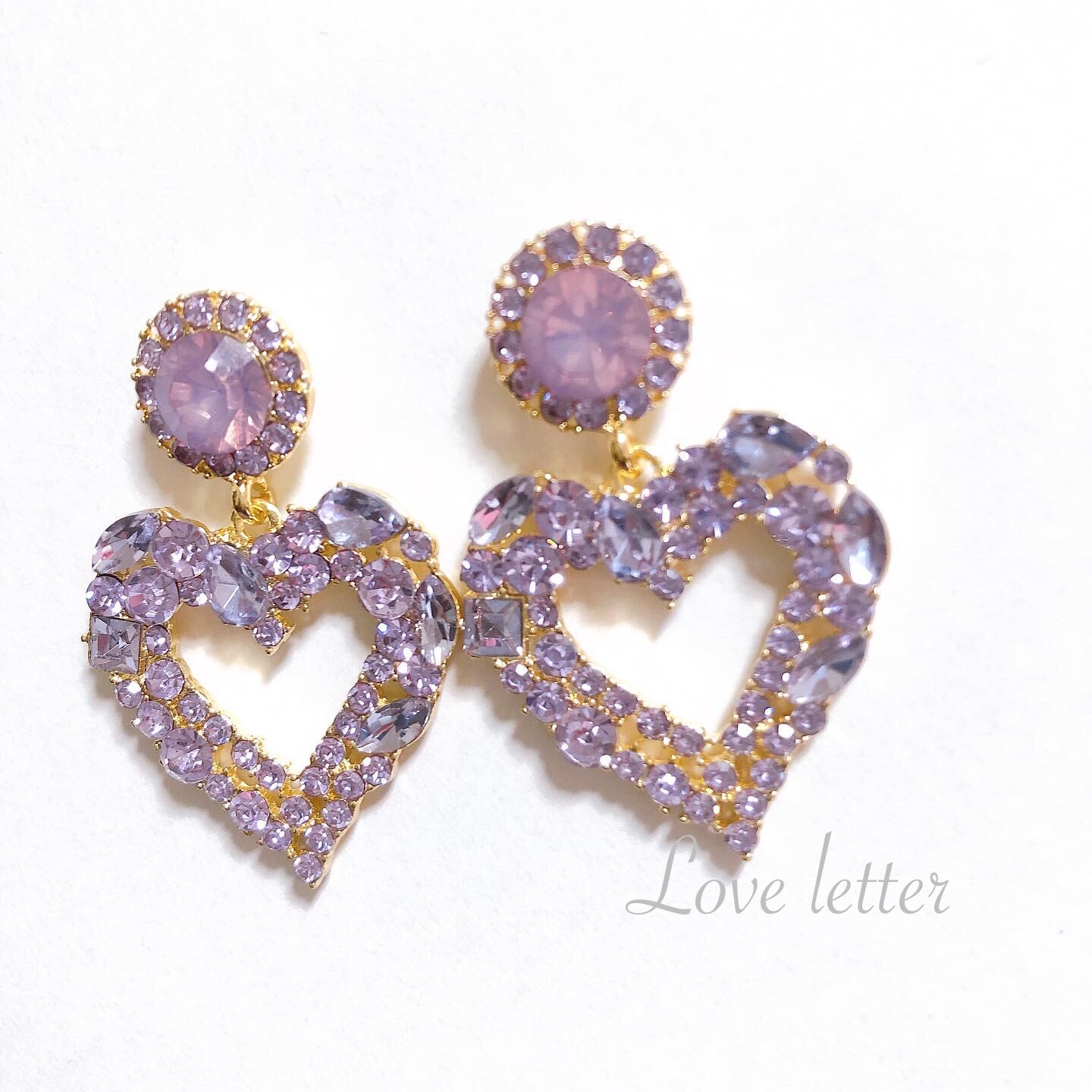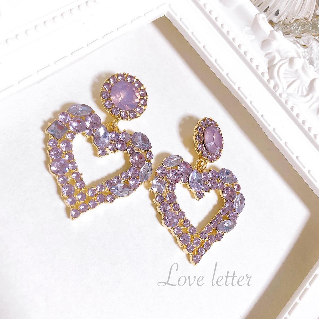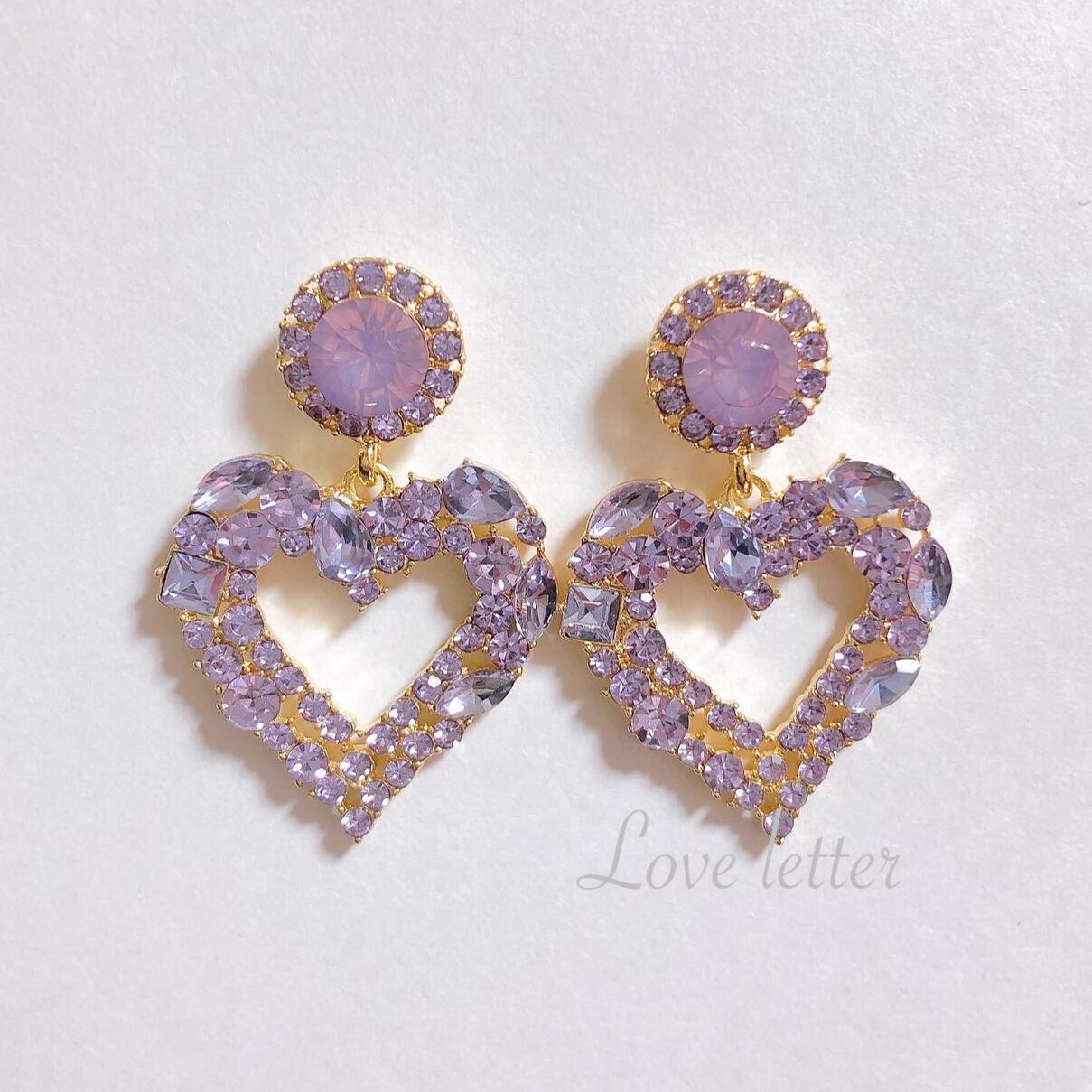クリスタルハートパープルビジューピアス 韓国 量産型 地雷