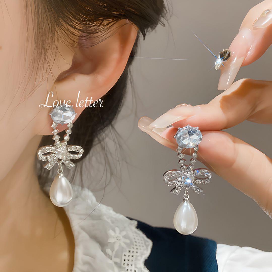 キラキラビジューパールリボンピアス 韓国 量産型 地雷 春夏秋冬