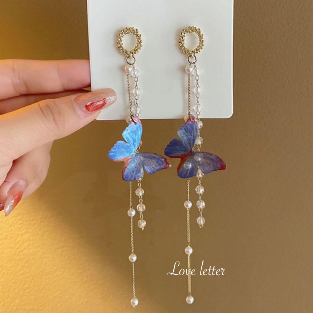 バタフライパールビーズロングピアス 韓国 蝶々 量産型 地雷