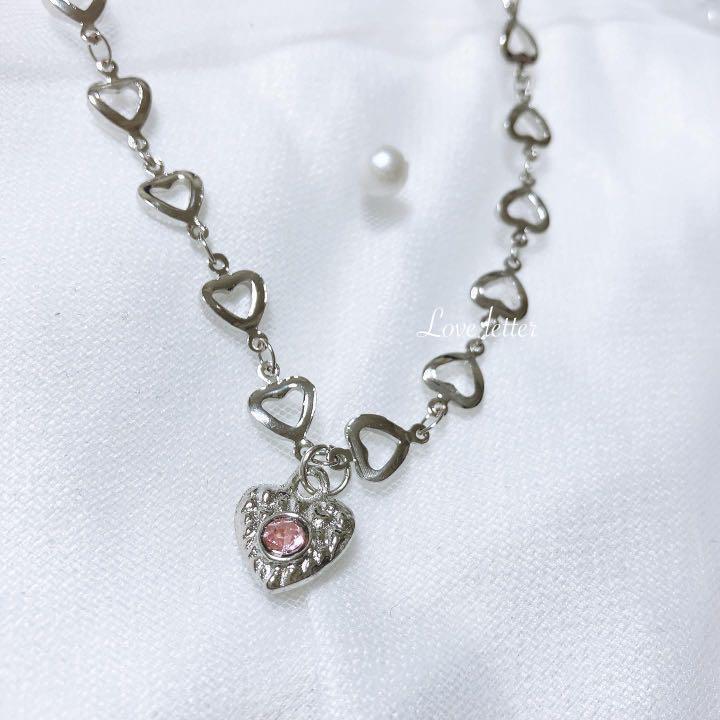 ハートチェーンピンクビジューチョーカーネックレス 韓国 量産型 華奢 キラキラ